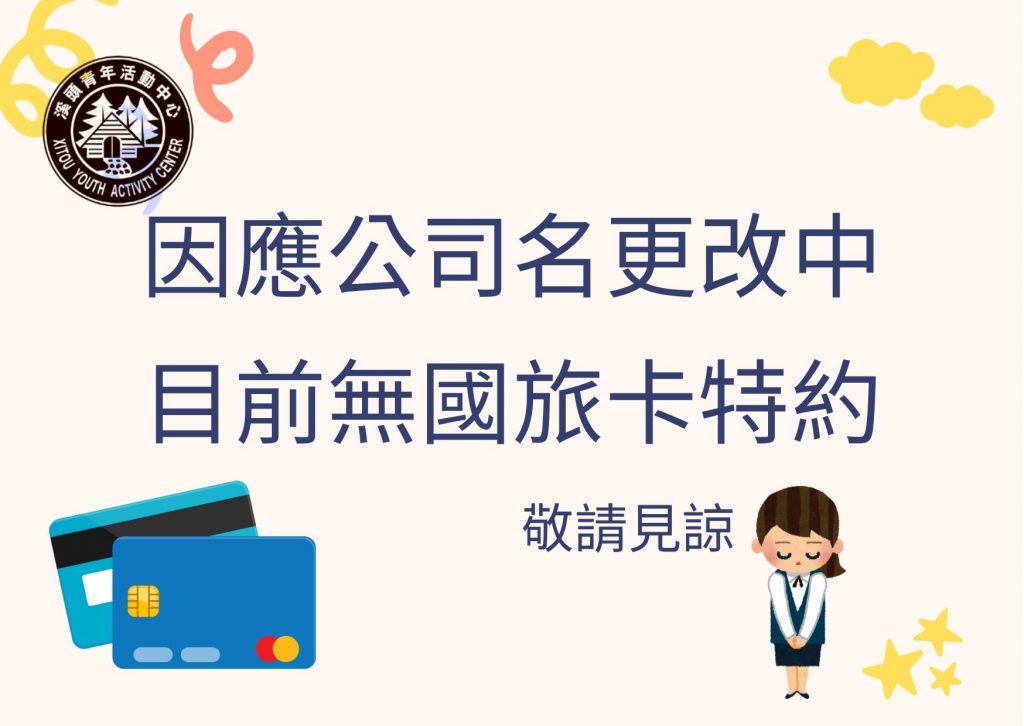 因應公司名稱變更,目前國旅卡申請程序尚未完成,目前暫時無法提供使用服務,待核准後將另行公告,造成不便,敬請見諒。