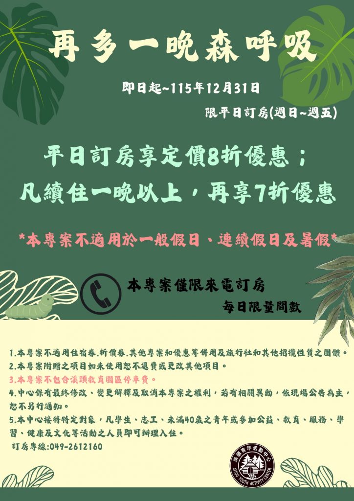 再多一晚森呼吸 即日起~115年12月31日,限平日訂房(週日~週五) 平日訂房享定價8折優惠; 凡續住一晚以上,再享7折優惠。 *本專案不適用於一般假日、連續假日及暑假* *本專案僅限 […]
