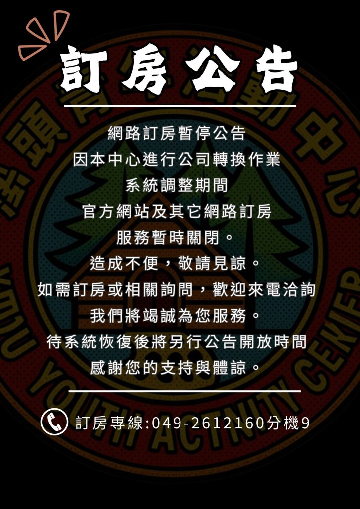 网络订房暂停公告🌟 因本中心进行公司转换作业,系统调整期间,官方网站及其它网络订房服务暂时关闭。 造成不便,敬请见谅。 如需订房或相关询问,欢迎来电洽询,我们将竭诚为您服务。 待系统恢复后,将另行公告 […]